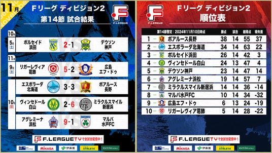 11月9日(土)~10日(日)に実施したFリーグ2024-2025 ディビジョン2 第14節の4試合について結果をお知らせいたします。