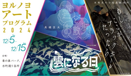 アーツコミッション・ヨコハマ(公益財団法人横浜市芸術文化振興財団)では「もしここがブラックホールだったら」「雲とお散歩」「雲になる日」を開催します。夜だからこそ楽しめる光とアートプログラムの「ヨルノヨ・アートプログラム」として、冬の横浜を彩ります。2024年12月5日(木)から12月15日(日)までの間、横浜の港のはじまりとも言える「象の鼻パーク」や横浜を代表する観光スポットに囲まれる「水町通り」など、まちを巡りながらアートをお楽しみください。