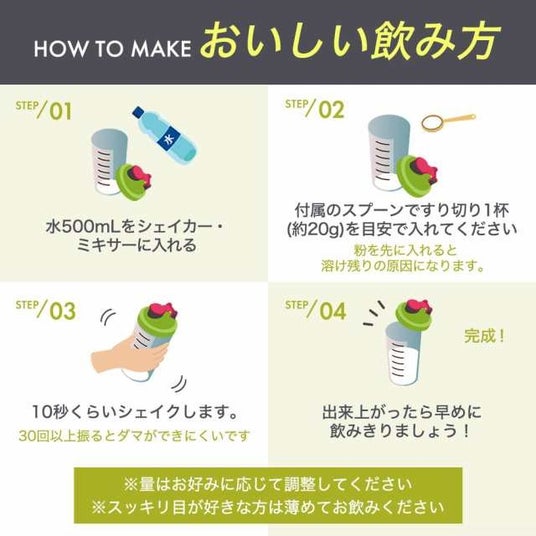 プロテインのように一気に摂取せずに少量ずつこまめに摂取するようにしてください。