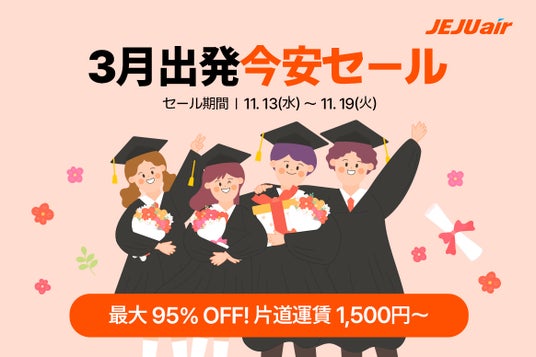 11月「今安セール」は、11/13(水)午前10時から11/19(火)午後5時まで1週間行われる。対象路線は、▲東京(成田)・大阪(関西)・福岡・名古屋(中部)・広島・松山・静岡・鹿児島・大分・札幌(新千歳)・沖縄(那覇)=仁川 ▲大阪(関西)=金浦 ▲東京(成田)・大阪(関西)・福岡・札幌(新千歳)=釜山路線で、最低片道運賃1,500円から販売する。搭乗期間は2025年3/1(土)から3/29(土)までで、会員ランクに応じて最大6,000円の追加割引も提供する。