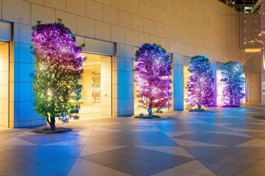 サンクン広場の高木には、シャンパンゴールドとホワイトカラーのイルミネーションを合わせゴージャス感ある灯りを演出、中木にはカラーチェンジ可能なイルミネーションを施し、時間とともに変化させることで飽きさせない特別感ある空間にしました。さらに金曜日から日曜日は特別演出として、中木のイルミネーションがよりカラフルに点灯します。