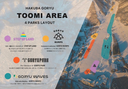 株式会社五竜(所在地:長野県北安曇郡白馬村、代表取締役社長:伊藤英喜、通称:白馬五竜)は、2024−25ウィンターシーズン、スキー場・エイブル白馬五竜のゲレンデに4つの「コンセプトエリア」を設営することを決定しました。毎年好評で4年目となるジブパークのGORYU PARK、雪のウネリを楽しめるGORYU WAVES、コブコースのGORYU BUMPSはそれぞれパワーアップした最高の状態で継続し、今シーズン新たに初心者のステップアップに特化した「STEP UP LAND」が誕生します。「自然地形を楽しむ」ことを目的にそれぞれ異なるコンセプトで運営する、エイブル白馬五竜ならではのエリア展開にご期待ください。