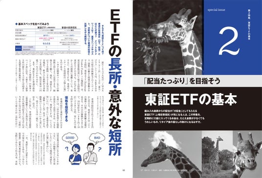 第2特集では、配当・分配金が大好きな人に根強い人気の「東証ETF」を基本から解説。新NISAで人気の投資信託は「全世界株式」や「S&P500」ですが、それと中身が同じものが東証に上場しているのです! こうした東証ETFを買って持っていれば、定期的に分配金が振り込まれます。