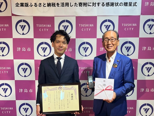 左:有限会社アクアテック 代表取締役 大和田 健斗、右:津島市長 日比 一昭氏