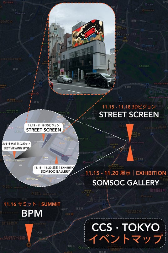 展示期間中の11月15日から11月18日まで、SOMSOC GALLERY近接の3Dビジョンに、「ComfyUI」のアートワークが放映されます。