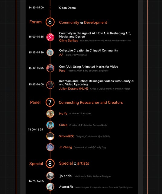 コアComfyUI開発者と著名なAIアーティストを集め、最新の技術進歩と創造的なアイデアを共有します。ディスカッションでは、グローバル市場向けのAIアプリケーションの国際化とローカリゼーションにも焦点を当てます。