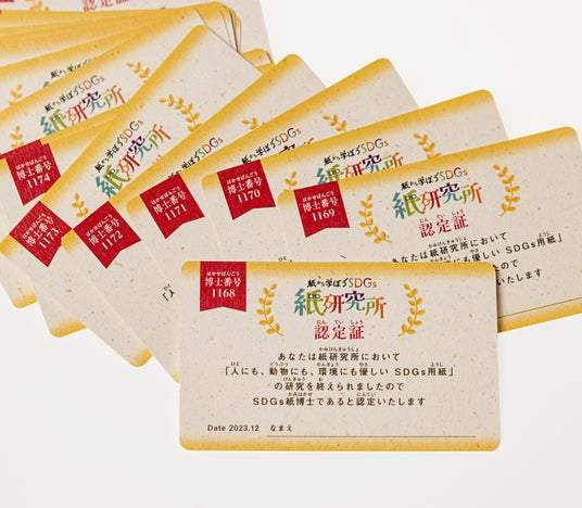 ▲子どもたちに渡した「紙研究所認定証」。バナナペーパーでできていることを知ると、においをかぐ子どもたちも