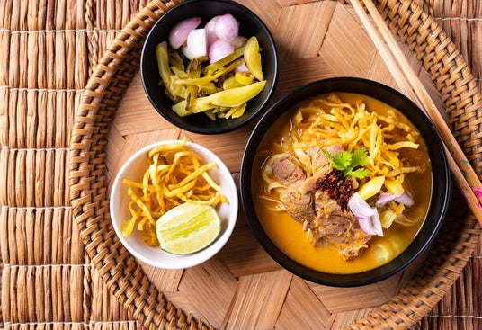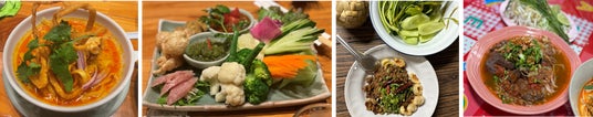 (左から)カオソーイ、ナムプリック・オーン、ラープ・チェンマイ、カノムチン・ナムギャオ