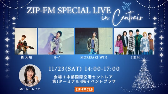 MCはZIP-FMナビゲーターの永田レイナ。出演アーティストは、MORISAKI WIN、森大翔、ルイ、JIJIM。日時は、11月23日(土)14時~17時。会場は、中部国際空港セントレア 第1ターミナル4階 イベントプラザ。このライブの模様は、後日12月22日(日)ZIP-FM内「SUNDAY EVENING SPECIAL」にてオンエアします。