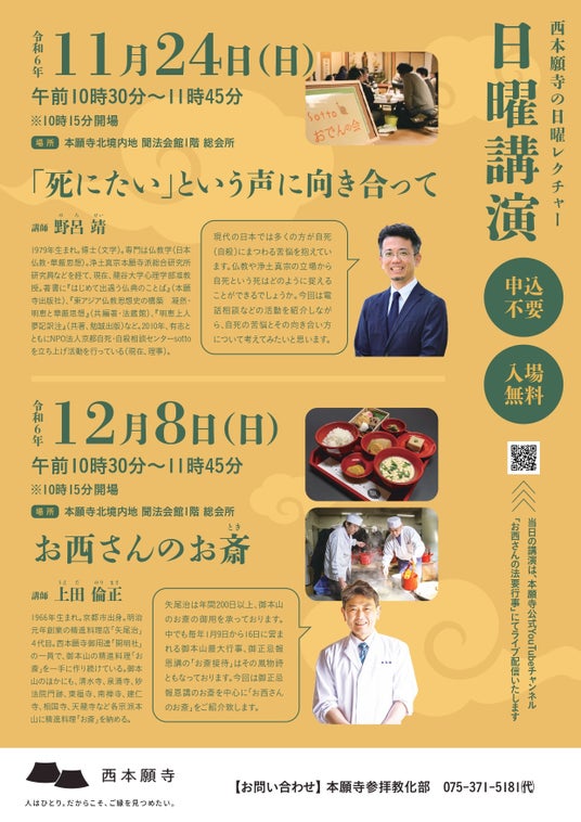 日曜講演 11月・12月開催のお知らせ『第8回 「死にたい」という声に向き合って』『第9回 お西さんのお斎』《申込不要・入場無料》