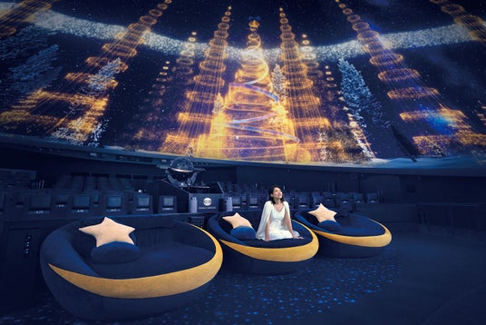 ドーム内に足を踏み入れると、星空の下で雪と光が降り注ぐ幻想的なクリスマスイルミネーションが皆様をお迎えいたします。本編の上映開始までの5~10分間に、暖かく快適な室内で星空とイルミネーションを一度に楽しめる贅沢な時間をお過ごしいただけます。