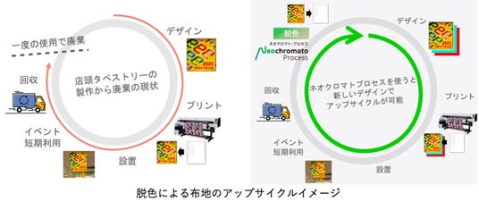 この度、ロフトとの新たな取り組みとして、店頭装飾で使用しているタペストリーの廃棄削減を目指し「店頭使用→回収→脱色→再印刷→店頭使用」という循環利用のトライアルを実施します。