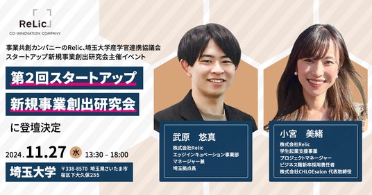 日本企業の新規事業開発やイノベーション創出を支援する事業共創カンパニーである株式会社Relic(本社:東京都渋谷区、代表取締役CEO:北嶋貴朗、以下「Relic」)は、埼玉大学産学官連携協議会・スタートアップ新規事業創出研究会が主催するイベント「第2回スタートアップ・新規事業創出研究会」に登壇します。2024年11月27日(水)13:30~18:00にさいたま市「埼玉大学総合研究棟1号館1Fシアター教室」にて開催されます。