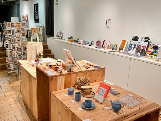 店舗内には、器やアクセサリーなど生活に寄り添うアートを中心とした常設作品コーナー「LIFE WITH ART」、企画展と連動した書棚も設置。店舗の営業時間中は、屋外のキッチンカー「NoM cafe」のカフェドリンクで、一息つくこともできます。
