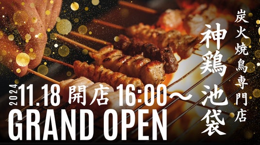 有限会社アルバ(所在地 : 東京都渋谷区恵比寿1-6-1)は、国産鶏の焼鳥を提供する「神鶏 池袋」(所在地 :東京都豊島区2-10-7藤田ビル 1F・B1F)を、11月18日(月)16:00にグランドオープンする運びとなりました。「神鶏 池袋」ではオープン記念キャンペーンを開催します。
