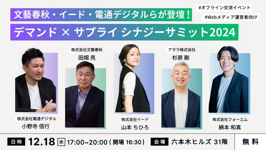 AnyMind Group株式会社(読み:エニーマインドグループ、代表取締役CEO:十河 宏輔)のグループ会社で、Webメディア運営企業及びアプリ開発者向けにメディアパートナー事業を展開する株式会社フォーエム(代表取締役:綿本和真、以下「当社」)は、株式会社電通デジタル、株式会社文藝春秋、株式会社イード、杉原剛氏をお迎えし、Webメディア運営者向け無料セミナー「デマンド×サプライ シナジーサミット2024」を2024年12月18日(水)17:00より当社オフィスにて開催いたします。