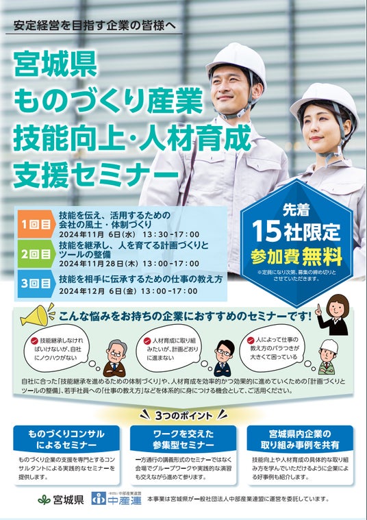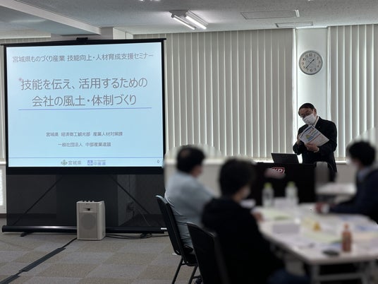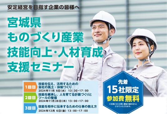 宮城県(所在地:宮城県仙台市青葉区本町3-8-1 県知事:村井 嘉浩)は、11月6日(水)、11月28日(木)、12月6日(金)の3日間で「ものづくり産業技能向上・人材育成支援セミナー」を開催することを計画しております。11月6日(水)に第1回「技能を伝え、活用するための会社の風土・体制づくり」が大変好評のうちに終了しました。