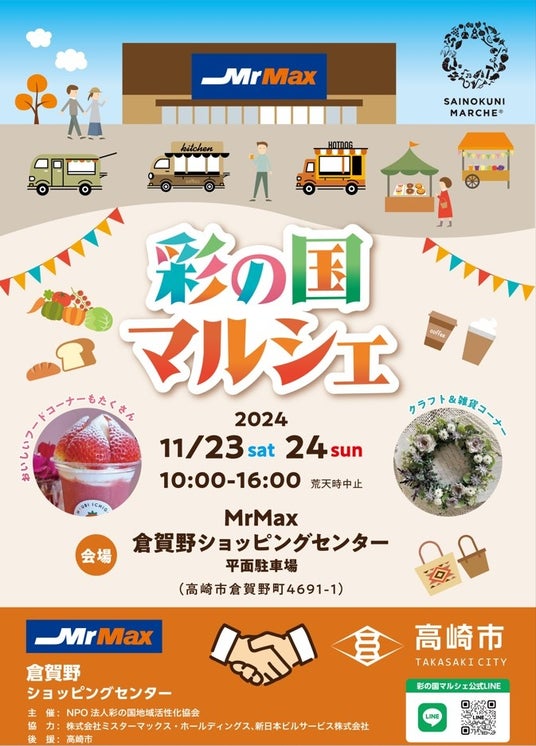 NPO法人 彩の国地域活性化協会(拠点:埼玉県さいたま市、代表理事:佐々木 輝伸)が主催する「彩の国マルシェ」は、2024年11月23日と24日の2日間、群馬県高崎市にあるMrMax倉賀野ショッピングセンターにて「彩の国マルシェ~MrMax Kuragano Style~」を開催いたします。