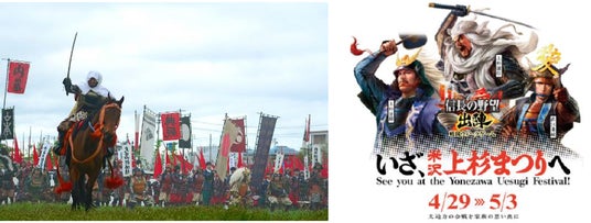 「ミニ上杉まつり in 日吉」」に出展した株式会社コーエーテクモゲームスの歴史ゲーム『信長の野望 出陣』とのコラボレーション企画も検討中です。スマートフォンにアプリをインストールして、ぜひ米沢市にも足を運んでいただければ幸いです。「ミニ上杉まつりin日吉」がきっかけとなって、数多くの方が「米沢上杉まつり」にもご参加いただけますことを願っております。