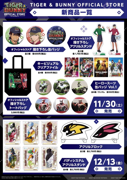 株式会社バンダイナムコピクチャーズ(本社:東京都杉並区、代表取締役社長:佐藤弘幸)は、オリジナルアニメ「TIGER & BUNNY」シリーズのオフィシャルストアを11月30日より期間限定でオープンいたします。