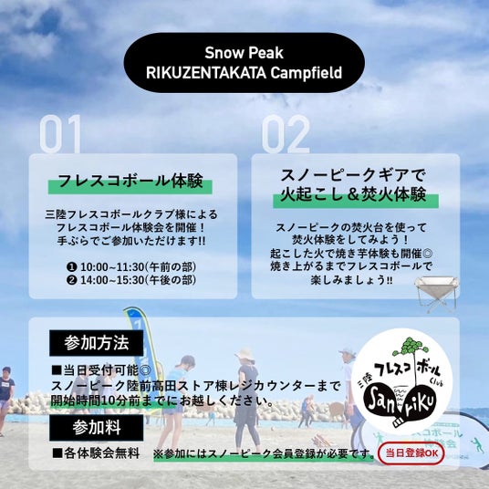 参加方法:スノーピーク陸前高田ストア横レジカウンターに、開始時間10分前までにお越しください。