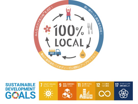 本来は廃棄されるはずの使用済み食用油を回収し、バイオディーゼル燃料に再生利用(アップサイクル)することで、『目黒川みんなのイルミネーション』は100%のエネルギー地産地消を実現し、国内外から注目を集めております。