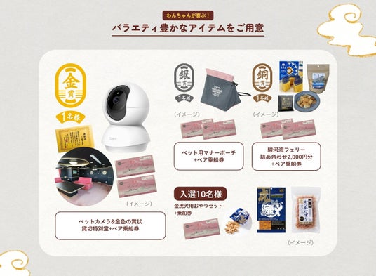 入選10名様:静岡県焼津産 金虎犬用おやつセット、駿河湾フェリー乗船券