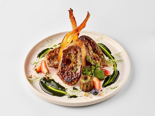 ・西尾抹茶のブリュレフレンチトースト 抹茶のカヌレとトリュフ添え(税込1,490円)/JINNAN CAFE