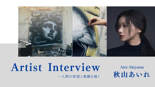 幼少期に画家の祖父から影響を受け、創作を始めた秋山は、人間の欲望や葛藤をテーマに、古典絵画の重厚感と現代的な解釈を融合した作品を展開しています。今回は、創作のきっかけや歴史的・現代的なモチーフの選び方などをお聞きしました。