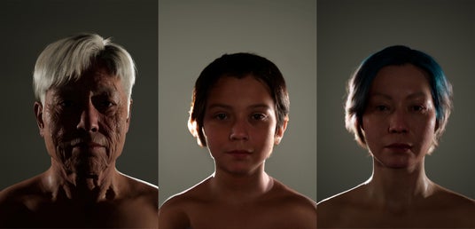 ハワイの日系アメリカ人をモデルに制作された「デジタルヒューマン」が登場する映像作品。日系人がピジン英語で朗読する物語を原田がシャドーイング(復唱)し、原田の朗読中の表情がデジタル技術によって作中の人物にトラッキング(同期)されています。そこで語られているのは、広島や山口から海を渡った人々にまつわる物語です。