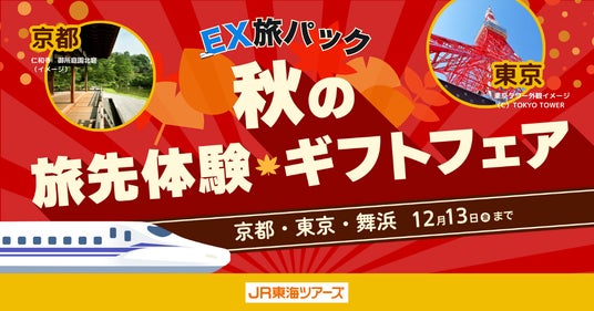 株式会社ジェイアール東海ツアーズ(本社:東京都中央区、以下JR東海ツアーズ)は、2024年11月15日(金)より12月13日(金)まで、「秋の旅先体験ギフトフェア」を開催します。このキャンペーンは、京都府、東京都、舞浜・新浦安エリアに宿泊するEX旅パックをご購入いただいた方を対象に、京都秋の特別拝観などの宿泊地近辺のおすすめEX旅先予約観光プランを進呈し、秋の旅行をさらにおトクに楽しんでいただくキャンペーンです。