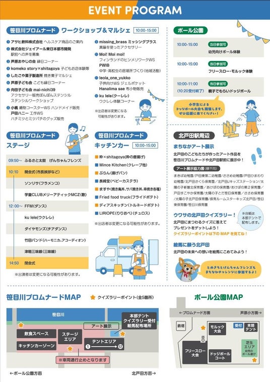 笹目川プロムナードをステージ発表、キッチンカーなどが楽しめる滞在の場に、ボール公園をモルックなど普段なかなか体験できない活動を楽しめる場に転換します。また、エリア全体をクイズラリーやアート展示で演出し、公共空間ににぎわいを創出することを目的としています。