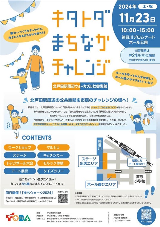 戸田市では、北戸田駅周辺を“居心地がよく歩きたくなる(=ウォーカブルな)まちなか“にするために、北戸田駅周辺ウォーカブル社会実験「キタトダまちなかチャレンジ」を開催します。