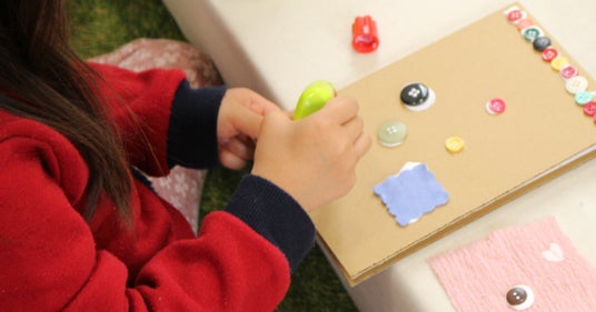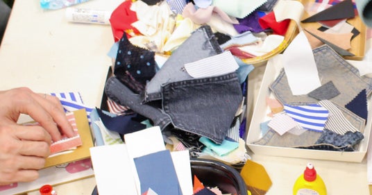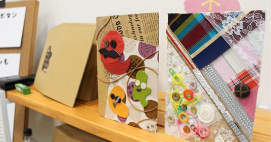 衣料品メーカー様・用紙メーカー様からご提供いただいた端切れの布、ボタン、リボン、カラフルな紙などがたくさん!子どもでも使いやすいボンドもご提供いただいています