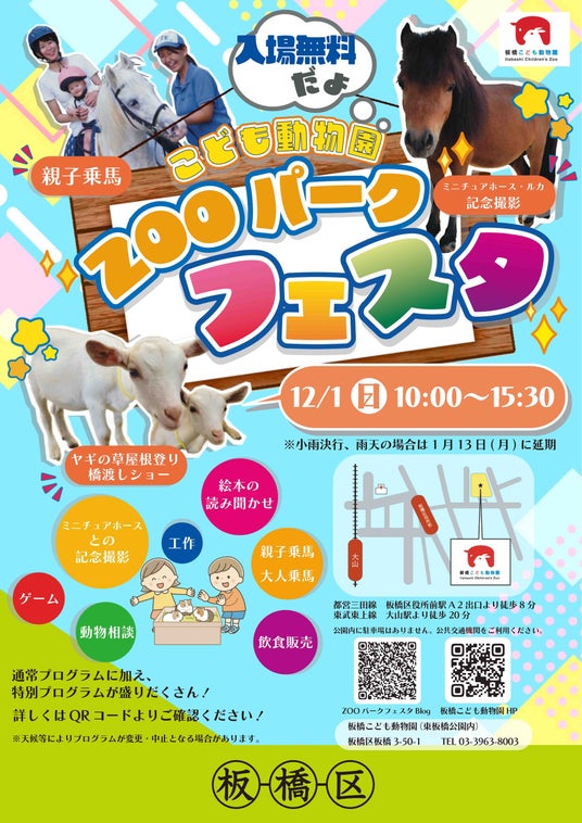 東板橋公園および同公園内にある板橋こども動物園にて、『ZOOパークフェスタ』を今年も開催します。板橋こども動物園内で飼育している動物と触れ合える通常プログラムのほか、親子乗馬体験・大人乗馬体験等の特別プログラムも実施予定です。その他にもキッチンカー、ワークショップ、絵本の読み聞かせ等、関連団体によるプログラムを予定しており、こどもから大人まで幅広い年代の方が楽しむことのできるイベントです。