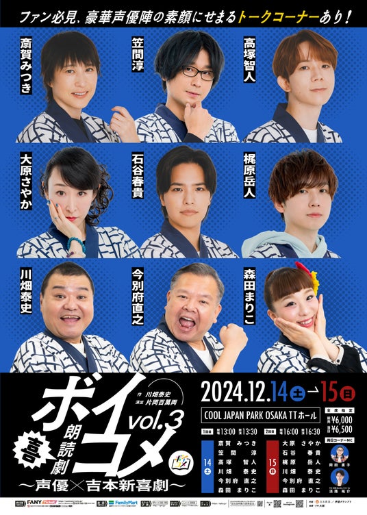 12月14日(土)、15日(日)に大阪・COOL JAPAN PARK OSAKA TTホールにて開催される人気声優と吉本新喜劇のコラボレーション作品の第三弾、「朗読劇ボイコメvol.3~声優×吉本新喜劇~」のメインビジュアルが解禁となりました。