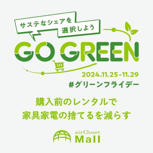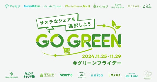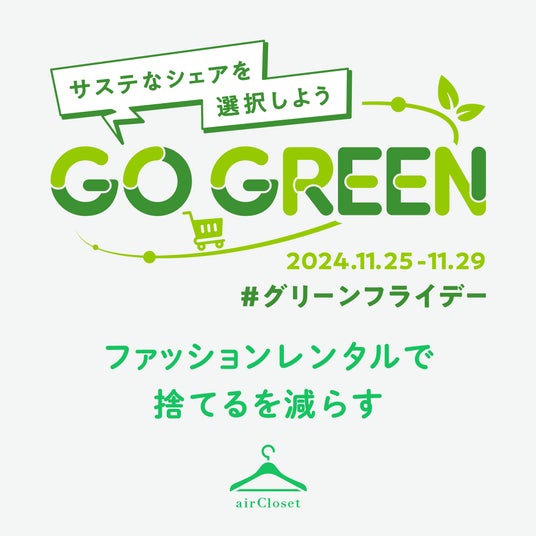 株式会社エアークローゼット(本社:東京都港区、代表取締役社長 兼 CEO:天沼 聰)は、サステナブルな消費のムーブメントである、グリーンフライデー(11月29日金曜日)に合わせ、一般社団法人シェアリングエコノミー協会様(以下、シェアエコ協会様)とシェアリングサービス事業者様15社とともに、環境に配慮した持続可能な消費行動について考える「GO GREEN プロジェクト」を行います。当社は、シェアリングがサステナブルな選択肢であることを継続的に発信していくことが重要と考え、シェアエコ協会様のSDGs推進委員会主幹事企業として、2022年の開始時より本プロジェクトを企画・先導しています。
