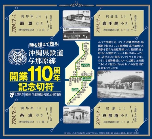 また与那原駅跡地にたつ軽便与那原駅舎展示資料館では、沖縄の軽便鉄道の歴史が貴重な資料と共に展示されるほか、激しい戦火に耐えた遺構として駅舎近くに残る柱の見学会も開催されます。JTB時刻表編集部が制作した110周年記念オリジナルの硬券やクリアファイルなどのノベルティも配布します。