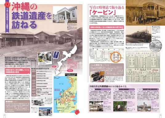 「JTB時刻表」12月号では、古い時刻表や写真から沖縄県の鉄道110年の歴史を紐解く巻頭特集を実施。今なお残る与那原線(那覇―与那原間)の鉄道遺構や、復元された与那原駅舎周辺の見どころなどもあわせてご紹介しています。