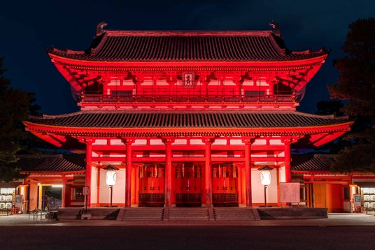 【重要文化財・應天門 應天門ライトアップ】 重要文化財・應天門のライトアップ。建築美を際立たせるダイナミックなライトアップが、平安神宮の神門である應天門の鮮やかな赤や朱色をより一層引き立てます。