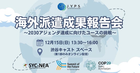 持続可能な社会に向けたジャパンユースプラットフォーム(JYPS)は、12月15日(日)に「JYPS海外派遣成果報告会」を渋谷キャストのイベントホールにて開催いたします。JYPSでは、2024年から2030年までを「行動と変革の6年間」の6年間と定め、国際的な若者参画を推進する一環として、一年目である2024年度は海外で開催された3つの国際会議に事務局員を派遣いたしました。本イベントでは、未来サミット、第8回北東アジアマルチステークホルダーフォーラム(NEA)、国連気候変動枠組条約第29回締約国会議(COP29)に派遣されたJYPS事務局員による現地での活動内容の紹介とともに、持続可能な開発目標(SDGs)達成におけるユース参画の課題について発表いたします。また、アフリカ開発会議(TICAD)や、国際連合経済社会理事会(ECOSOC Youth Forum)などの、関連する国際会議に向けた活動も併せて紹介いたします。