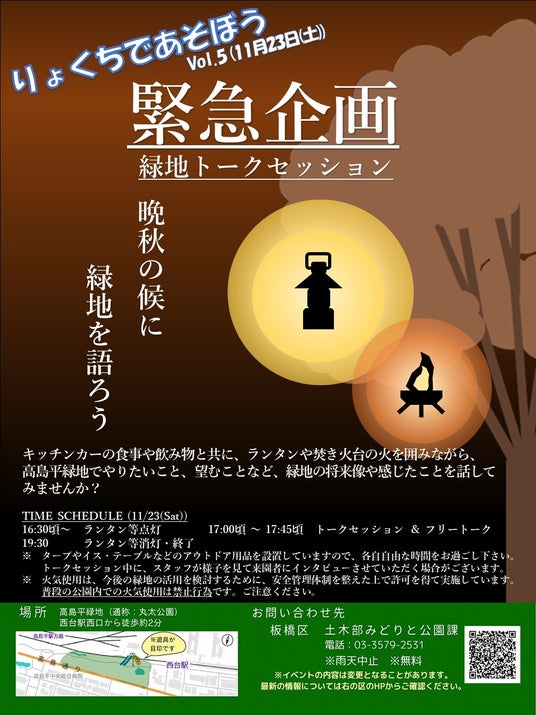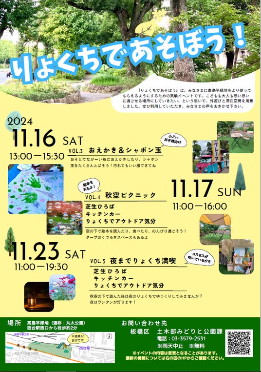 板橋区は、板橋区高島平地域のまちづくりの一環として、社会実験イベント「りょくちであそぼう」を開催しています。この度、令和6年11月23日(土)、都営三田線西台駅と高島平駅間にある高島平緑地(板橋区高島平九丁目1番)で「りょくちであそぼうVol.5『夜までりょくち満喫』」を開催します。