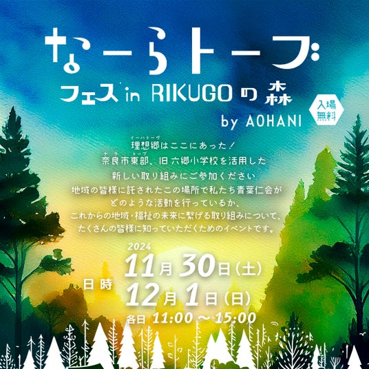 社会福祉法人青葉仁会(奈良県奈良市杣ノ川町)は、2024年11月30日(土)~12月1日(日)の2日間、昨年度奈良市針ヶ別所町に開所した多機能型事業所(就労継続支援B型、就労移行支援、生活介護)「RIKUGOの森」にて、「なーらトーブ in RIKUGOの森」と題したイベントを開催いたします。
