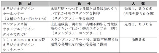 京王線・井の頭線の全駅とスタンプラリーの対象となる銭湯で配布するスタンプシートを持参の上、スタンプ設置駅と沿線にある31の対象銭湯を巡りスタンプを集めると、景品として人気デザイナー田渕周平氏がデザインしたオリジナルキーホルダー(2駅+銭湯4軒で達成)やコンテックス製オリジナルタオルてぬぐい(4駅+銭湯8軒で達成)をプレゼントします。さらに、すべてのスタンプを集め、高幡不動駅で対象の応募用紙を投函していただくと、5名様にオリジナルデザインのサウナハット(羊毛ハット作家 blackmouton製)が当たる抽選も実施します。