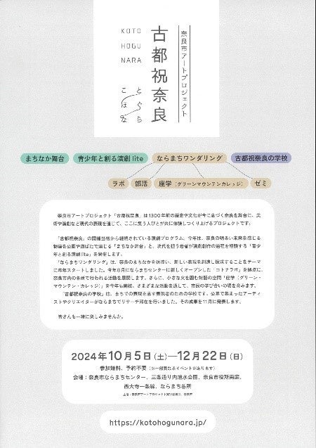 平成28年度に実施した「東アジア文化都市2016奈良市」を契機に始まった奈良市アートプロジェクト「古都祝奈良(ことほぐなら)」の開催中プログラムの告知および観覧募集をします。