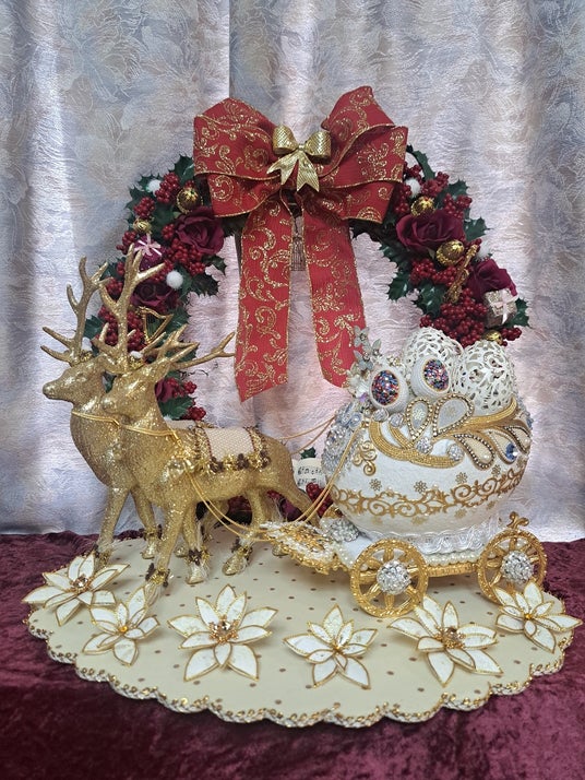 後)「ROSE & ROSE リース」(素材:うずら、ゴールド金粉仕上げ、フラワーアレンジメント 約径51×幅10cm) 前)「氷の国から」(素材:オーストリッチ、グース、チキン、うずら カット・シルクパウダー・ビーズステッチなど 約幅40×奥行26×高さ28cm)