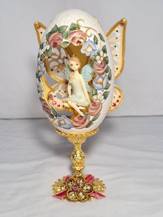 「フラワーフェアリー」(素材:グース、前面の花部はトールペイント、卵の後部は羽の透かしにカット、約幅10×奥行10×高さ18cm)93,500円