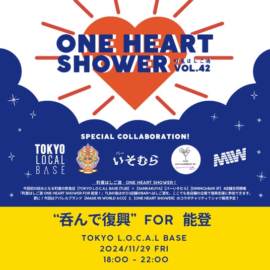 被災地の「復興支援」や「地域活性化」を活動の目的とするNPO法人TOKYO L.O.C.A.L (東京都荒川区/代表理事:丸山慎二郎)は、被災地に直接行けない方々にも災害支援を身近に感じていただくため、復興支援イベント『ONE HEART SHOWER vol.42 for能登』を11月29日(金)18時より開催いたします。“飲んで復興”をコンセプトに、通算42回目となる今回は、荒川区町屋にある人気飲食店4店舗による初の合同開催が実現。東京で能登半島への支援活動に取り組みます。
