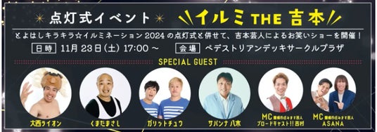 咲き誇れ!穂の華!!『とよはしキラキラ☆イルミネーション2024』の点灯式イベントも11月23日17時から開催されます。当日は『イルミTHE吉本』(※吉本芸人によるお笑いショーとのコラボ点灯式)もございます!くまだまさしさんやサバンナ八木さんなどの盛り上がるメンバーが登場!