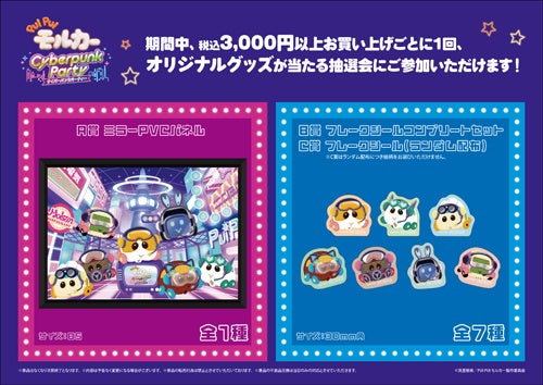 公式WEBショップ「PUI PUI モルカーPARKING」からの期間限定リアル店舗となる本イベントでは、サイバーパンク風衣装のモルカーたちの新規ビジュアルでお届けします!その新規ビジュアルを使用した新商品の販売や、ご購入のお客様にオリジナル特典が当たる抽選などを行います。